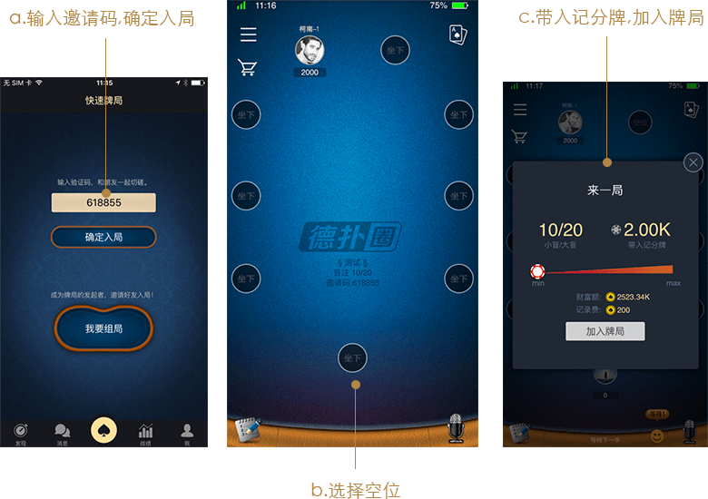 开启控制玩家买入后,玩家在牌桌上买入/补充筹瑪时,系统为房主发送消息,经房主确定玩家的请求后,玩家买入/补充筹瑪才会生效。若不开启控制玩家买入,则玩家在上桌时可自由买入/补充筹瑪。